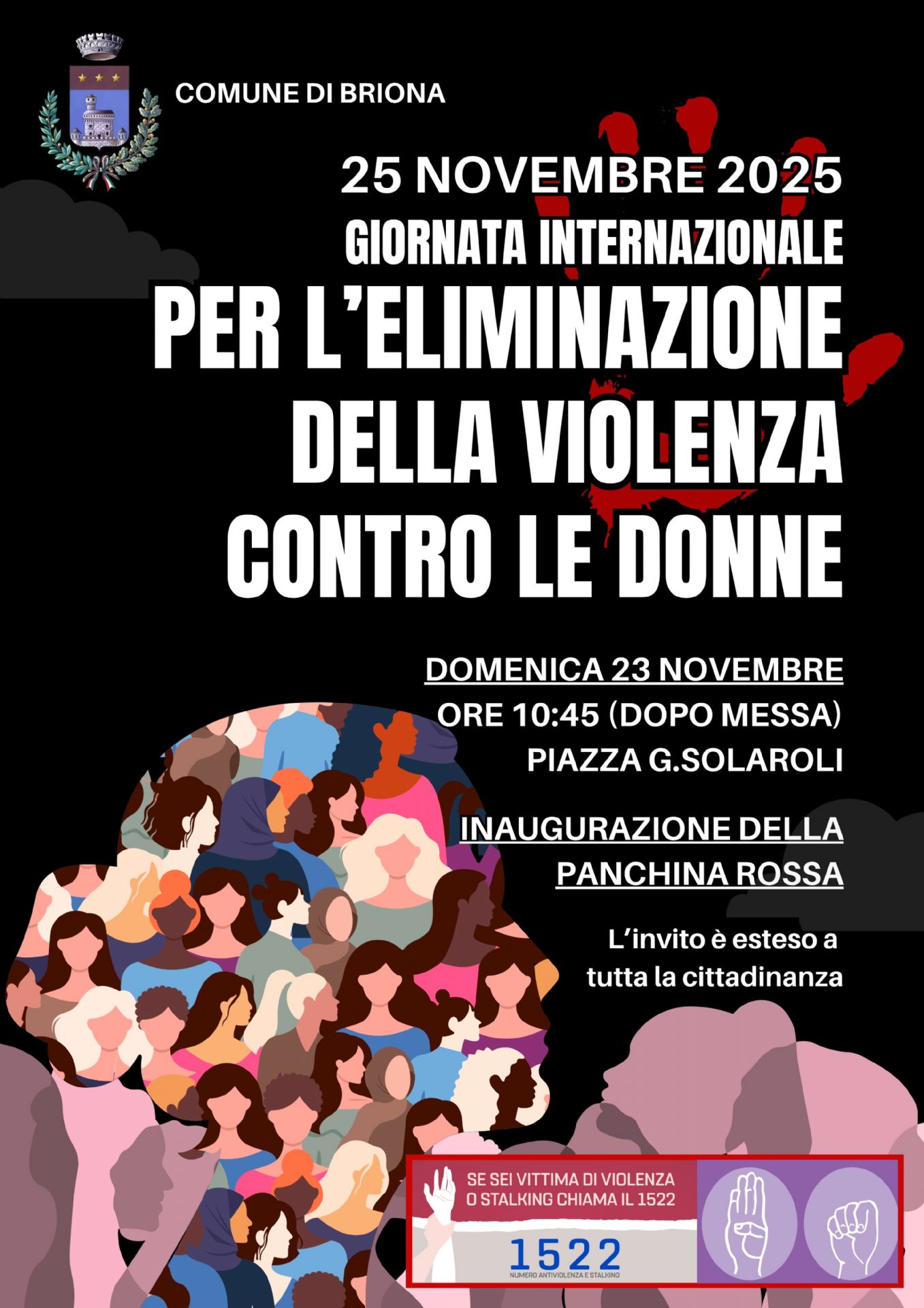 Nell'occasione del 25 novembre, Giornata Internazionale per l'Eliminazione della Violenza contro le Donne, il Comune di Briona inaugura una panchina rossa, simbolo contro la violenza di genere, che vuole ricordare il posto vuoto lasciato dalle donne vittime di femminicidio e violenza.