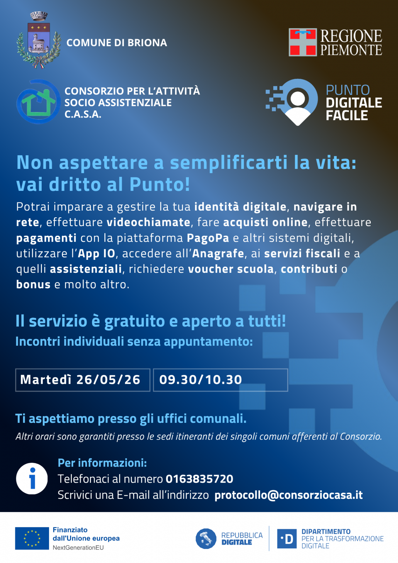 Il Comune di Briona e il Consorzio Socio Assistenziale CASA, grazie a dei fondi dell'Unione Europea, hanno attivato il servizio "Punto Digitale Facile": uno sportello digitale in grado di assistere le persone che hanno difficoltà nell'accesso alle nuove tecnologie, come la gestione dell'identità digitale (SPID), utilizzare l'app IO, la piattaforma PagoPA e i vari servizi disponibili sulla rete.