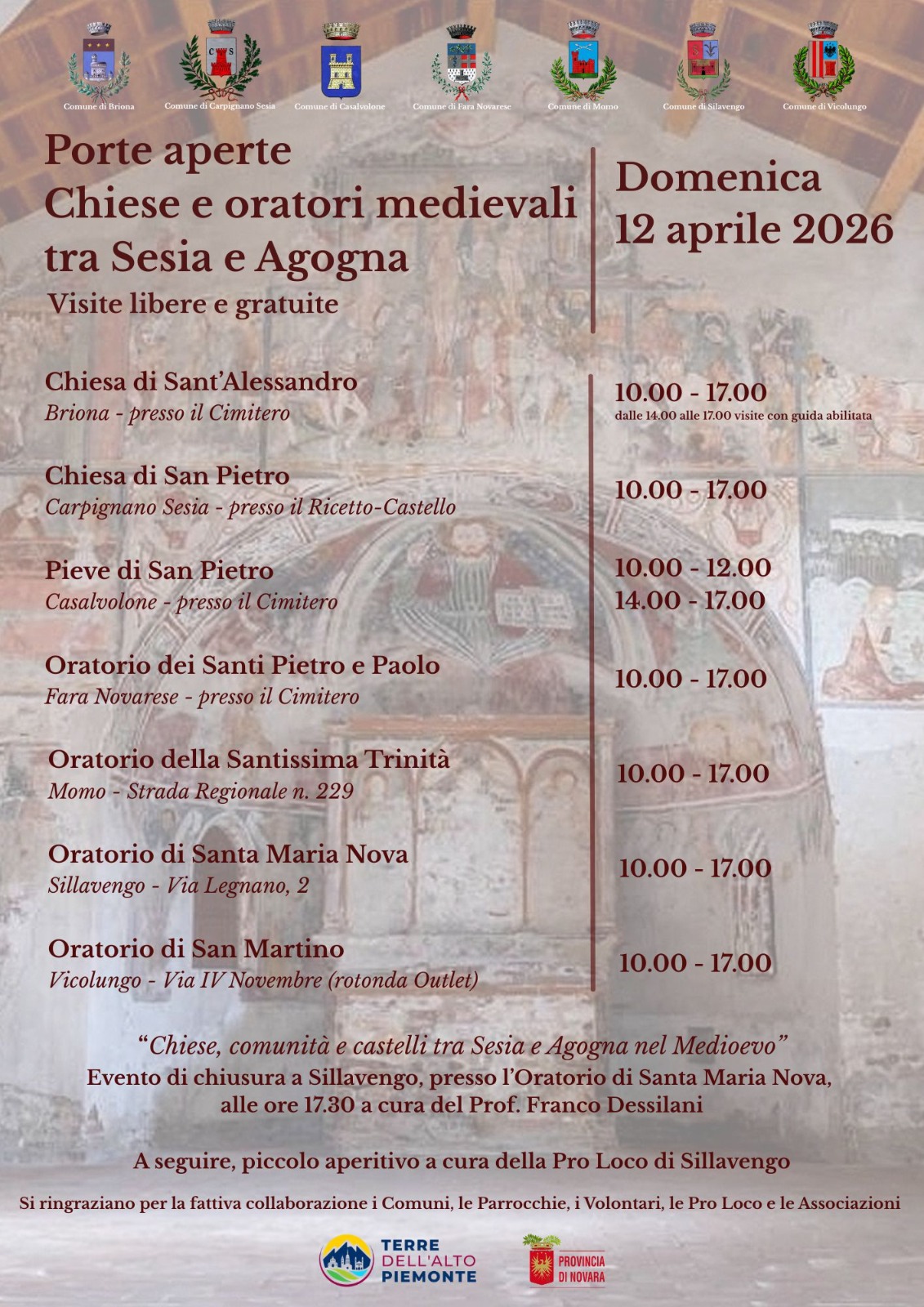 Alle 17.30 evento di chiusura "Chiese, comunità e castelli tra Sesia e Agogna nel Medioevo" a cura del Prof. Franco Dessilani. A seguire piccolo aperitivo a cura della Pro Loco di Sillavengo