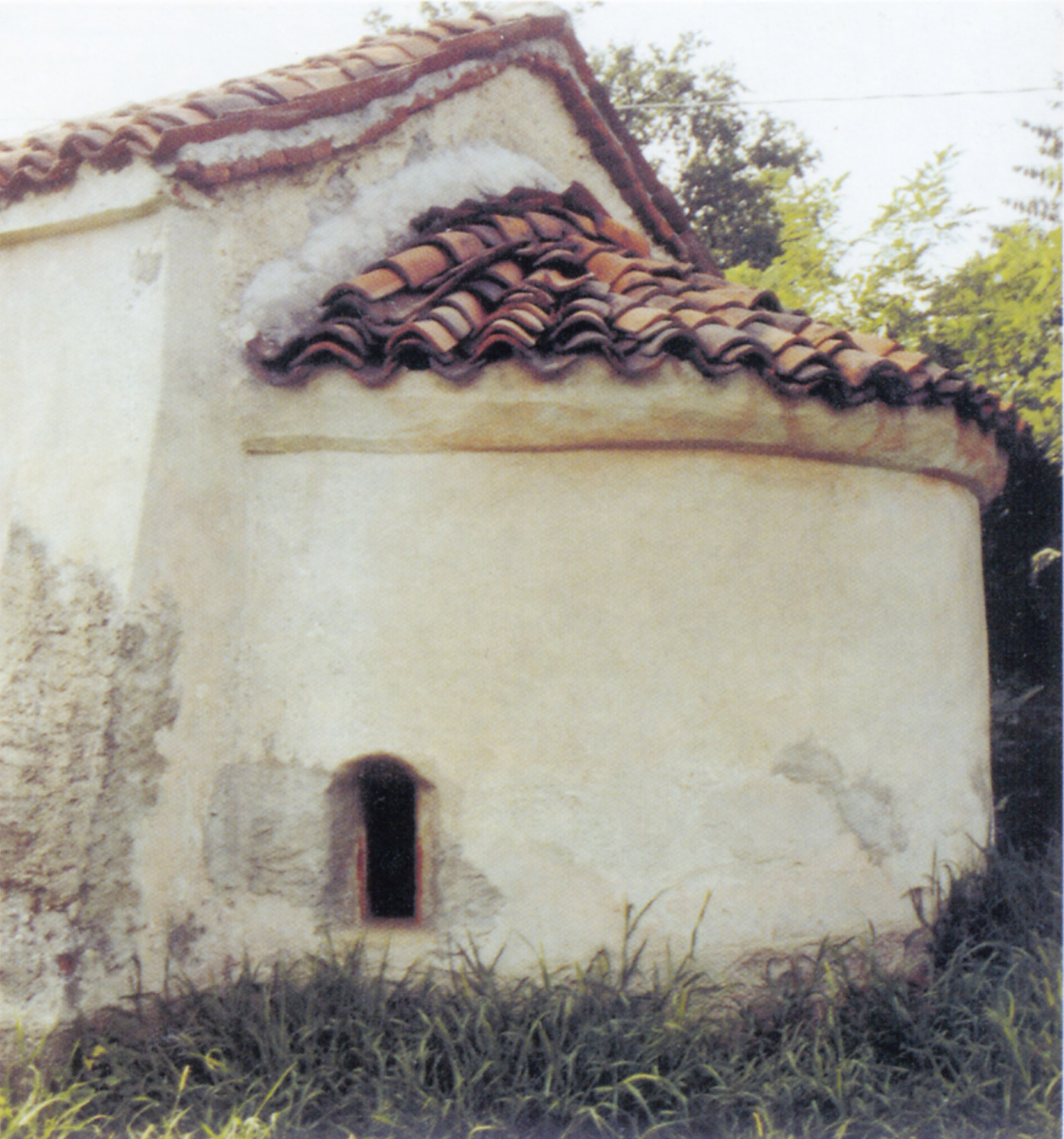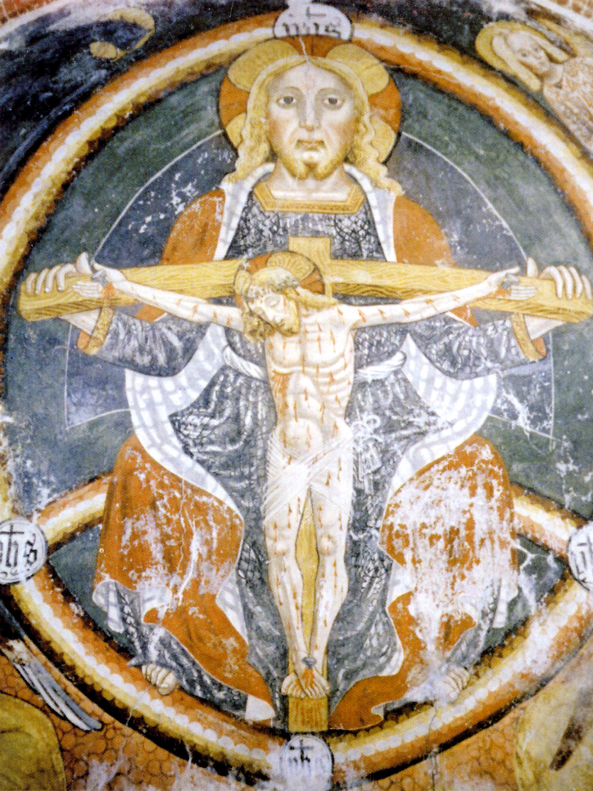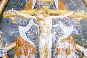Si sono poi verificati nel corso dei secoli tre interventi di restauro (uno nel Settecento, uno nell'Ottocento ed uno nel Novecento), che hanno in parte alterato la qualità ed alcune caratteristiche dei dipinti. L’affresco della conca absidale rappresenta al centro, in una grande mandorla, il “Trono della Misericordia”, che, in una composizione verticale, riunisce il “Cristo pantocratore” ed il “Cristo morto sulla croce”, con il corpo coperto di piaghe sanguinanti. I simboli degli evangelisti (leone alato, aquila, vitello alato e angelo) e le figure dei “santi Sebastiano e Rocco” (particolarmente venerati per la funzione di protettori contro le epidemie) completano la decorazione absidale. Particolare l’assenza della colomba dello Spirito Santo, probabilmente richiesta dal committente per mettere maggiormente in evidenza il senso salvifico della rappresentazione; da notare anche la presenza del trigramma YHS di San Bernardino, presente negli incroci dell’arcobaleno (sul quale è seduto Dio Padre rappresentato nelle sembianze del Figlio).