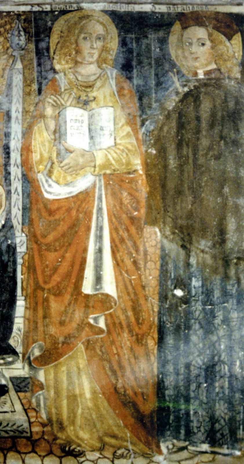La parete settentrionale rappresenta cinque figure di santi ed una “Madonna con il Bambino”. La figura di “Sant'Antonio Abate”, caratterizzata da una lunga barba grigia, è la prima a presentarsi agli occhi di chi avanza dall'ingresso, seguono poi “San Pietro”, di nuovo “Sant'Antonio” bastonato dai demoni (rappresentati come mostri alati con una lunga coda irsuta, corna e artigli) con Dio Padre in cielo, ed infine “Maria Maddalena” e “Giovanni Battista” che affiancano la Madonna in trono con il Bambino. Di rilievo il vaso per unguenti tenuto stretto a sé da Maria Maddalena, a ricordo degli episodi in cui utilizzò profumi preziosi per cospargerli sul corpo di Cristo, e il gesto della mano destra di Giovanni Battista, che indica il Bambino Gesù; questo gesto, unitamente alla scritta “Ecce agnus dei Ecce qui tolit pecata mo(n)di” sul filatterio e alla presenza dell’agnello sempre sul filatterio, simbolizzano il Bambino come vittima designata per la salvezza del genere umano. La Madonna in trono è dipinta con diversi elementi (come il baldacchino posteriore, l’alternanza dei colori delle stoffe) che contribuiscono a creare profondità, stabilendo una certa distanza tra la Madonna e lo spettatore.